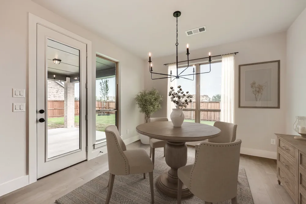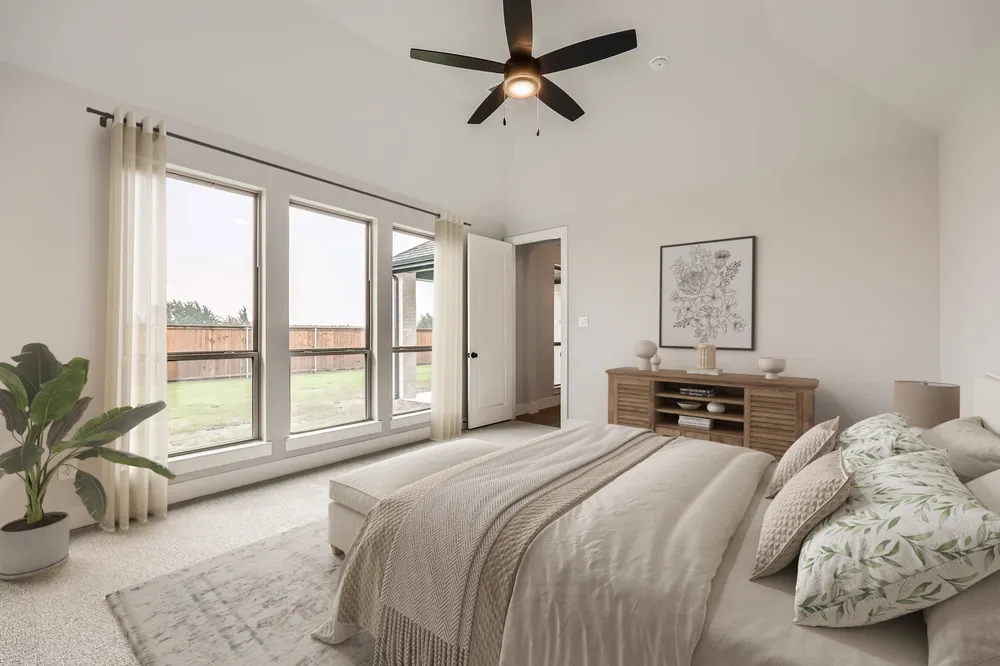 This charming 1-story home offers 2,311 square feet of living space, featuring 4 bedrooms, 2.5 baths, and a 2-car garage. The spacious family room is a standout, complete with a gas fireplace and tall ceilings, creating a welcoming atmosphere. The gourmet kitchen is well-equipped for both cooking and entertaining, with extended upper cabinetry, a gas cooktop, and a walk-in pantry for added organization. The main bath is designed for relaxation, featuring split vanities, a freestanding tub, and a luxurious shower. The exterior of the home is equally impressive, with light cream brick complemented by dark gray trim, creating a sleek and modern look. Situated on a 60-foot lot, this home offers a comfortable and private setting while being just one block away from community amenities. Residents will enjoy easy access to parks, walking trails, and recreational areas. With its open floor plan, thoughtful design, and excellent location, this home is ideal for families looking to enjoy both everyday living and entertaining.