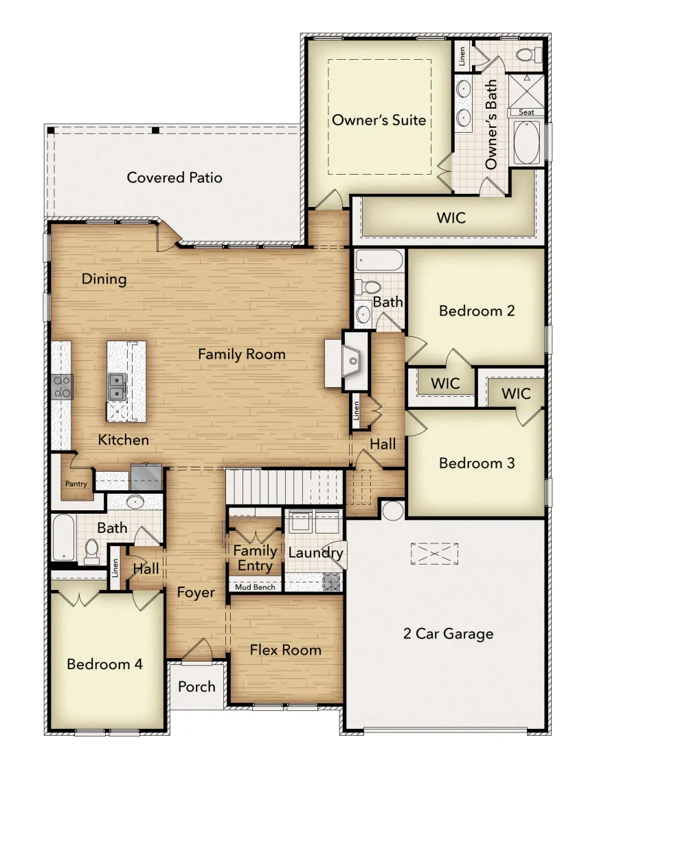 As you enter into the first floor of the home, the foyer leads you past a bedroom and bathroom on one side and a flex room on the other before opening up into the kitchen, dining room and family room. This open-concept home gives you plenty of reasons to host dinner parties or holiday events for your friends and family with a spacious dining room, oversized island within the kitchen and a charming fireplace to gather around at the end of the night. The owners suite is situated just off of the family room and overlooks the pristine backyard scene. With the owners bathroom featuring a standing bathtub, separate walk-in shower, a double vanity and an incredible walk-in closetits as if you have your own private spa in the comfort of your own home. Moving upstairs, the room opens up into an ideal loft areagiving you the option of creating a second living room for your home. With an additional bedroom and bathroom located on the second floor as well, youll never run out of space in this 3,130 square foot home.