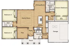 Inside, the 2,033-square-foot plan is designed with the busy family in mind. Keep all the main living concentrated in an open floor plan where walls dont divide you. Whether youre watching television in the large family room, entertaining in the dining room, or handling the kitchen duties, you can see everyone and everything. The kitchens center island functions like a hub. Sit down for a casual meal at the breakfast bar, sort the mail, catch up on the daily happenings, wash the dishes, or start prepping the next meal. Adjacent to the kitchen, you have the functional center of the home: mudroom and laundry. A hall bench and closet provide you with the organization you need to keep the clutter at bay. Your owner's suite is tucked away in the farthest corner of this single-level floor plan. Separated with a vestibule entrance, you have a private retreat. The owner's bath includes both a soaking tub and walk-in shower, plus dual vanities and a private water closet, so its very shareable. The other 2 secondary bedrooms of this split floor plan anchor the other side of the home where they share the second full bath. Both bedrooms are identically sized with plenty of space for anyone from a toddler to teen to another adult member of your household. The Cibolo also gives you the freedom of a flex room off the foyer. Convert it to the space you want to meet your needs.