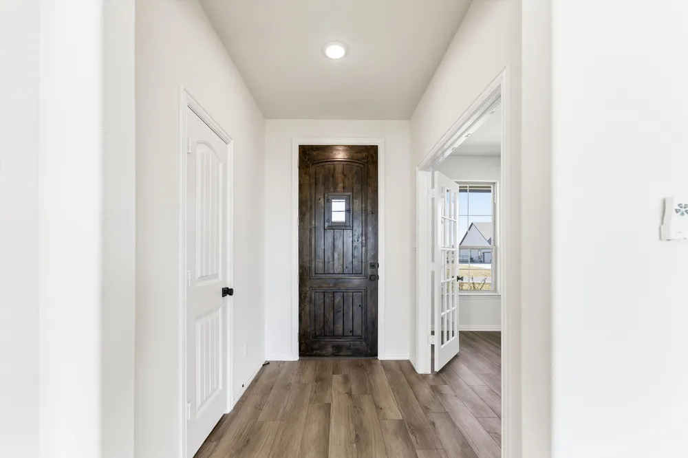 Inside, the 2,033-square-foot plan is designed with the busy family in mind. Keep all the main living concentrated in an open floor plan where walls dont divide you. Whether youre watching television in the large family room, entertaining in the dining room, or handling the kitchen duties, you can see everyone and everything. The kitchens center island functions like a hub. Sit down for a casual meal at the breakfast bar, sort the mail, catch up on the daily happenings, wash the dishes, or start prepping the next meal. Adjacent to the kitchen, you have the functional center of the home: mudroom and laundry. A hall bench and closet provide you with the organization you need to keep the clutter at bay. Your owner's suite is tucked away in the farthest corner of this single-level floor plan. Separated with a vestibule entrance, you have a private retreat. The owner's bath includes both a soaking tub and walk-in shower, plus dual vanities and a private water closet, so its very shareable. The other 2 secondary bedrooms of this split floor plan anchor the other side of the home where they share the second full bath. Both bedrooms are identically sized with plenty of space for anyone from a toddler to teen to another adult member of your household. The Cibolo also gives you the freedom of a flex room off the foyer. Convert it to the space you want to meet your needs.
