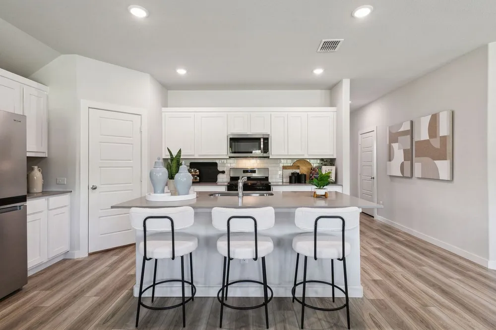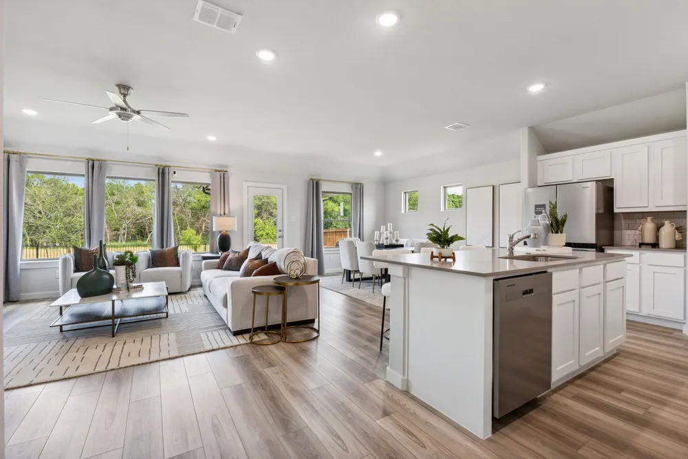 The Emmy II boasts an expansive main living area with a gourmet island kitchen, beautiful living room and snug dining area. The addition of a covered patio amplifies your entertaining space, so be sure to add a bistro table and chairs for morning cappuccino al fresco with neighbors. Three secondary bedrooms offer private space but can flex into the ultimate hobby room, yoga spot or home office!