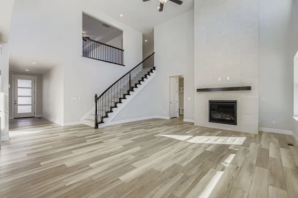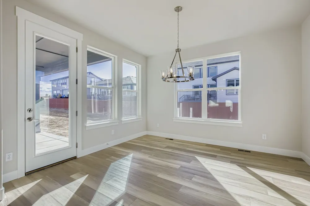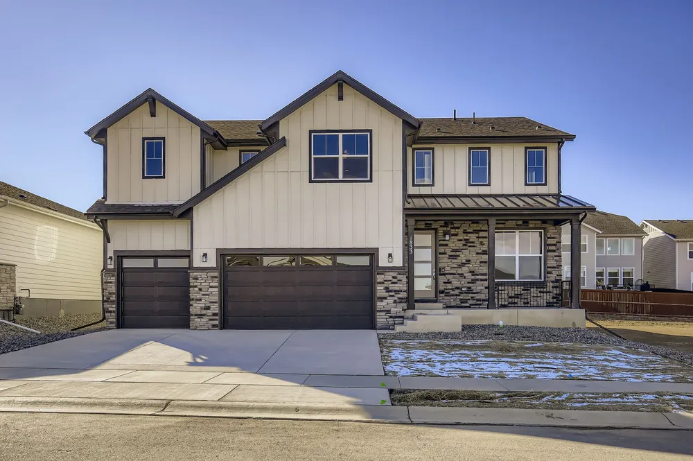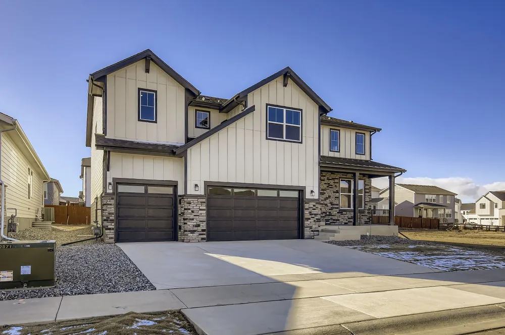 Picture yourself in the grand two-story home with 4 bedrooms, 3 full bathrooms, 2 half baths, large covered front porch and a 3-car garage. As you enter the spacious foyer with high ceilings, you will find a study tucked to one side with French doors. Continue into the open concept dining room, kitchen and family room with a two-story ceiling. Enjoy impressive features in the kitchen such as granite countertops, built-in stainless steel appliances, a large kitchen island and spacious two tone upper and lower cabinets in painted Harbor and stained Almond. The kitchen opens to the family room with a floor to ceiling fireplace and soaring windows to let the sunlight in. Enter the first of two main suites through a private entry off the mudroom. This first floor main suite is great for a guest room or multi-generational living and includes a walk-in-closet with an attached bath featuring a walk-in shower. Once upstairs you are greeted with a loft, perfect for a game room or study space and your laundry room. The second main suite can be found upstairs and features beautiful tray ceilings and a fan. Through the double doors in the main bedroom, enter your luxurious bath retreat, complete with an impressive walk-in closet, double vanities, a walk-in shower and soaking tub. Upstairs, you will find an open view into the family room, a spacious game room, a powder bath and two additional bedrooms with walk-in closets and Jack-n-Jill style bathroom. This home comes with an unfinished basement with 9' ceilings. Enjoy a Colorado sunset? Head outside to your covered outdoor patio perfect for outdoor entertaining. There is plenty of room for the whole family in this American Legend Home. Located next to RainDance National Golf Course in Sugar Hills!