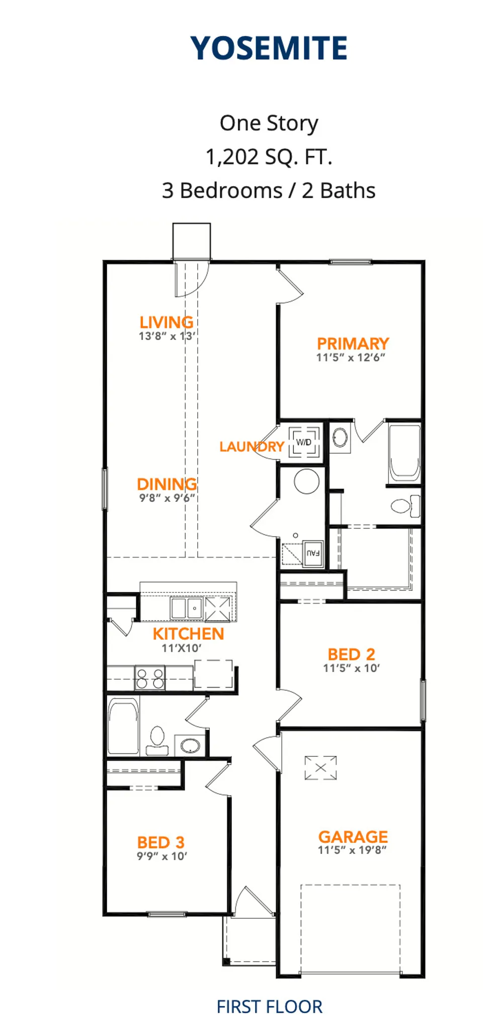 Model 1202 A1 - Yosemite The Yosemite Plan from our Freedom Series is a cozy and efficient single-story home featuring 3 bedrooms, 2 bathrooms, a 1-car garage, and 1,202 square feet of smartly designed living space. This split-level floorplan places two secondary bedrooms and a full bathroom at the front of the home, offering privacy and convenience. Continue into the open-concept living area, where the kitchen with a central island overlooks the dining area and family room—perfect for meals, gatherings, and quality family time. The primary suite is thoughtfully positioned off the family room for added privacy and includes a private bathroom and walk-in closet. The laundry room is also conveniently located on this side of the home for easy access. Known for providing the lowest price and price per square foot, National Homecorp is here to help you get more home for your money! SELLER-Paid Closing Costs: Enjoy up to 3% closing cost contribution when you use NHC Mortgage and our preferred title company. With more space for less money plus exclusive savings through seller-paid incentives, the Yosemite Plan is the smart choice for your next home. Start your journey to homeownership today!