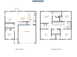 Model 1804-2 A5 - Madison The Madison Plan from our Liberty Series combines style and functionality in a layout that maximizes space for your family’s needs. This 2-story home features 5 bedrooms, 3 bathrooms, a 2-car garage, and 1,804 square feet of well-designed living space.As you step inside, you’ll find a main-level bedroom and a full bathroom, offering a convenient option for guests or a home office. Beyond that, the home opens to a bright and airy living area, where the family room, dining area, and open kitchen with a central island come together seamlessly to create a welcoming space for entertainment and everyday living. Stairs located in the family room lead to the upper level.Upstairs, the primary suite serves as a private retreat, complete with an ensuite bathroom. The upper level also includes three additional bedrooms, another full bathroom, and a conveniently located laundry room to simplify daily tasks.