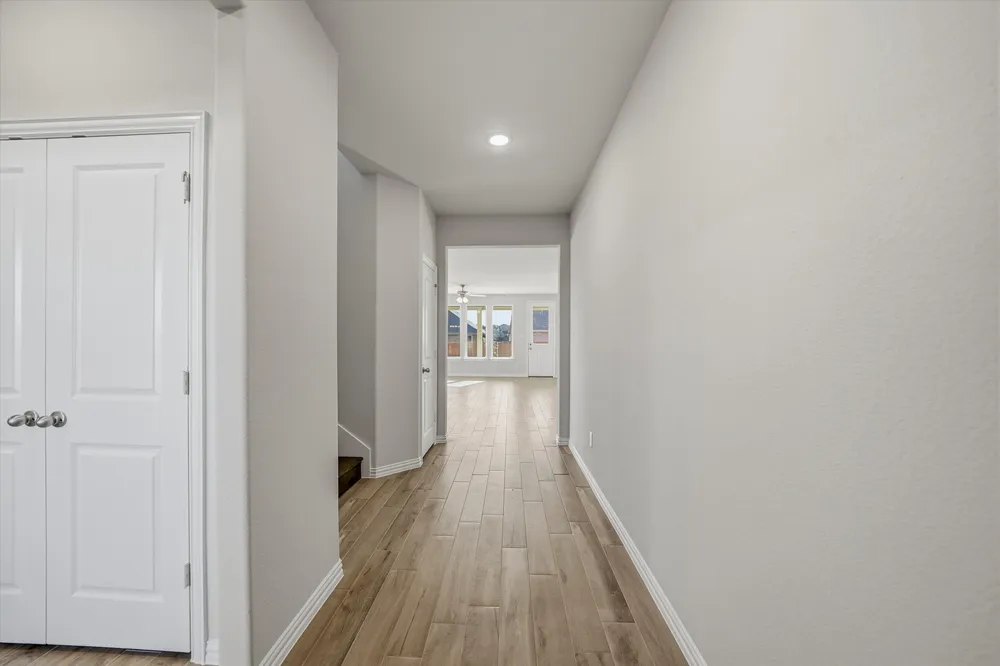 The four-bedroom Nueces floor plan is 2,858 square feet of functional living space. This two-story home was designed with every kind of homeowner in mindit exemplifies the importance of togetherness by offering spaces for families to gather, as well as spacious bedrooms so every person has an area to call their own. Upon entering the home from the two-car garage, youll walk through the mudroom with a built-in storage bench and pass the walk-in pantry and separate laundry room. The gourmet kitchen includes an island with overhang for seating, extravagant storage options and lots of counter space. Past the kitchen is the open-concept dining and family room that can be laid out to meet the needs and style preferences of your family. Through a short hallway youll find the oversized owner suite with a double-sink bathroom, soaking tub, separate shower and walk-in closet. Finishing off the main floor is a powder room and a flex room toward the front of the house that can be used as a home office, virtual learning space or playroom. The second floor opens up to a multi-purpose loft that would make a perfect second family room. It also includes three bedrooms, each with their own walk-in closets, two full bathrooms and an additional storage closet. Outside spaces include a welcoming front porch and large covered patio adjoining the back of the house.