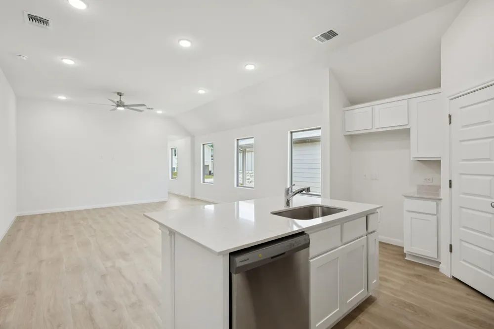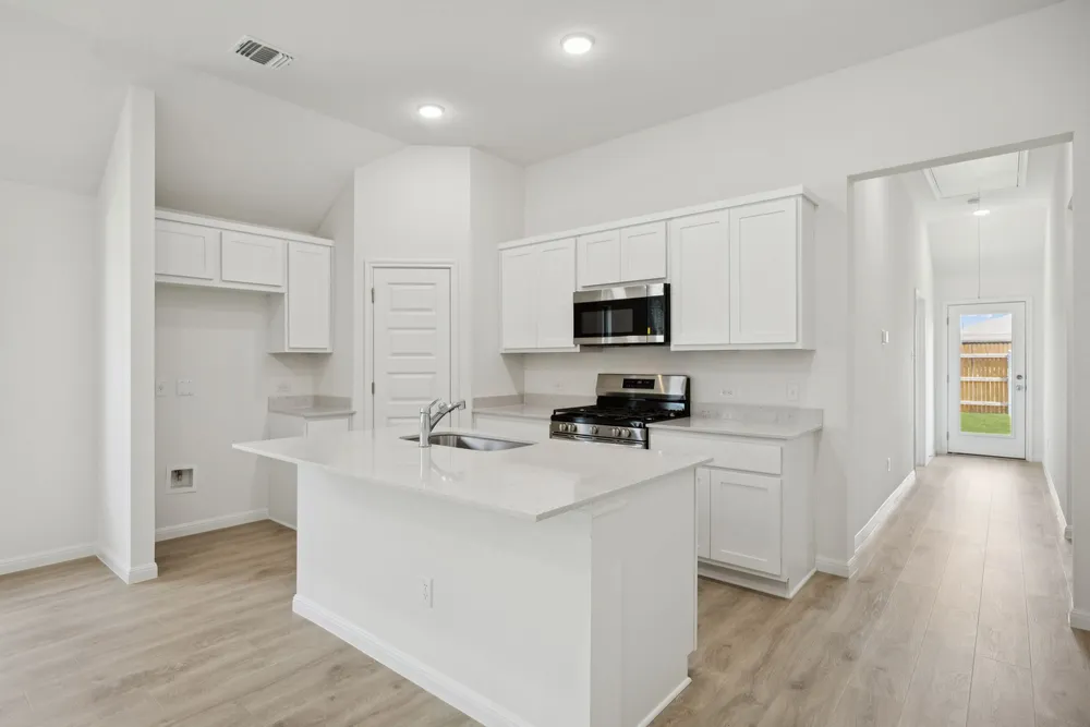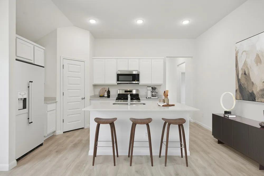 The Cypress, where contemporary elegance meets practical comfort. This thoughtfully designed floor plan offers an inviting blend of open spaces and refined details, making it perfect for both entertaining and everyday living. This layout creates a seamless connection between the kitchen, dining, and living spaces, enhancing the flow and openness of the home. The kitchen is a highlight, featuring a generous island with seating, premium appliances, and ample storage, making it both a functional workspace and a gathering spot.