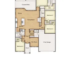 The Verbena floor plan features a modern, open-concept layout and the sought-after features todays homeowners are searching for. With four bedrooms, three bathrooms, and a flex room, this plan boasts just over 2,400 square feet of functional living space. Upon entering the home off the front porch, youre welcomed by an inviting foyer. Immediately to the left is a hallway with a bedroom, walk-in closet and full bathroom, as well as a linen closet. Across the foyer is a flex room, perfect for a home office, formal dining room or whatever need your family has for the space. Past the foyer is the family entry, with storage space and mud bench, which leads to the laundry room and two or three car attached garage. Through the entrance, the home opens up to a large family room with a stately fireplace. Adjacent to the family room is a gourmet kitchen, equipped with a walk-in pantry, ample counter space and an oversized island. Finishing off this open-concept living area is a dining space which overlooks the covered back patio. The remainder of this one-story floor plan is just off the living space. A hall leads to two bedrooms with walk-in closets, another linen closet and a shared full bathroom. The back corner of the home offers privacy for the owners suite, featuring a massive walk-in closet and bathroom with a dual-sink vanity, standalone soaking tub and glass-enclosed shower.