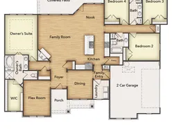 The 4-bedroom Colorado 3 presents a creative yet sensible layout of the homes 2,483 square feet of living space. Right from the front entrance, you can see the entire main living area. This open concept enhances the spacious feeling and makes it easy to have conversations no matter where you areperfect for entertaining! The kitchen is a definite eye-catcher in the Colorado 3. Weve incorporated a massive center island that doubles your counter space and provides comfortable seating for 4 people at the breakfast bar. You can also enjoy the view of the fireplace in the family room. If a formal dining room is on your new home wish list, check that off. Just a few steps from the kitchen, this floor plan has just the room for those special occasions. If formal isnt your thing, use this as a playroom or a living room. Across the foyer, the Colorado 3 also gives you a flex room to expand on the versatility. With a few small adjustments, you could convert it to a fifth bedroom. The design of the owner's suite is one of the (many) reasons people love this floor plan. The bedroom is nestled in the back of the home under a tray ceiling that accentuates the roominess. The Colorado 3 smartly uses space in the bathroom for both a soaking tub and step-in shower, along with dual vanities and a private water closet. Then your suite is completed with an expansive walk-in closet with wooden shelves and racks ready and waiting for your wardrobe. The 3 secondary bedrooms are clustered in a suite-like space on the other side of the homes layout. Two of them offer a walk-in closet, while the third one gives just a little bit more floor space. The 3 bedrooms share the homes second full bath. For a home that creates the ideal balance between togetherness and privacy, the Colorado 3 is fit to be tried!