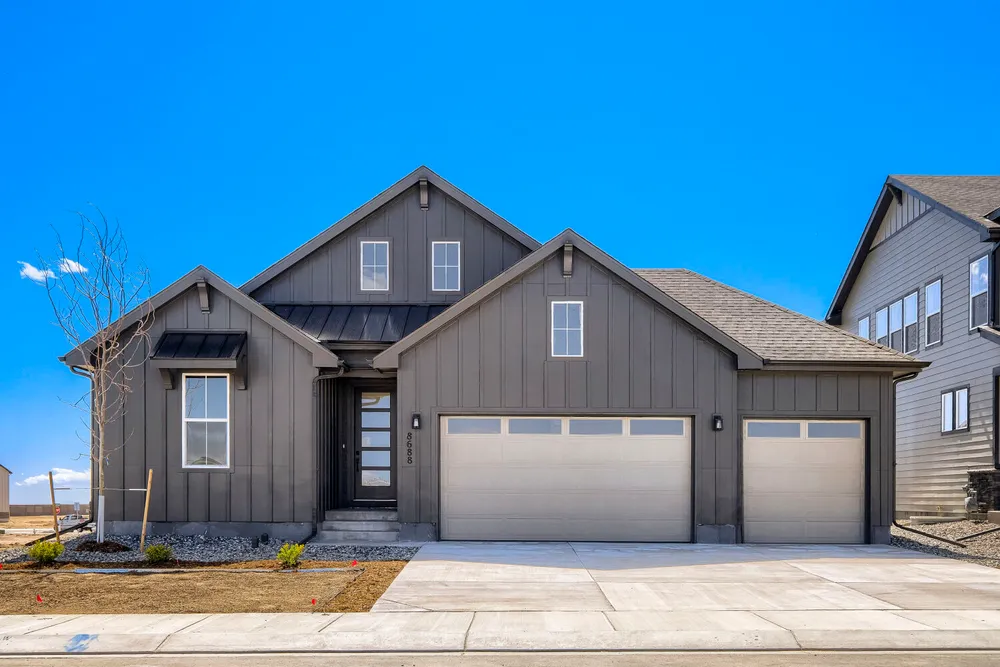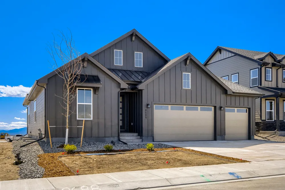 This charming ranch home offers 4 bedrooms, 3 full baths and a spacious 4-car garage, blending style, comfort and functionality. The open-concept design features a large kitchen with upgraded cabinetry, stainless steel appliances, a generous center island and a bright dining nook. The great room is warm and inviting, with a stunning floor-to-ceiling fireplace and large windows that fill the space with natural light. Just off the main living area, a sliding door opens up to an extended outdoor living space, perfect for relaxing or entertaining. The main level also includes a convenient laundry room near the garage entrance, two secondary bedrooms with a shared full bath and a private primary suite featuring dual vanities, a freestanding soaking tub, a walk-in shower and a generous walk-in closet. The finished basement adds even more flexibility with a large rec room, a stylish wet bar, a private guest bedroom and a full bath, perfect for game nights or hosting guests. Additional highlights include custom closets with shoe racks, a tankless water heater and a 96% efficiency-rated furnace for year-round comfort and energy savings.