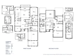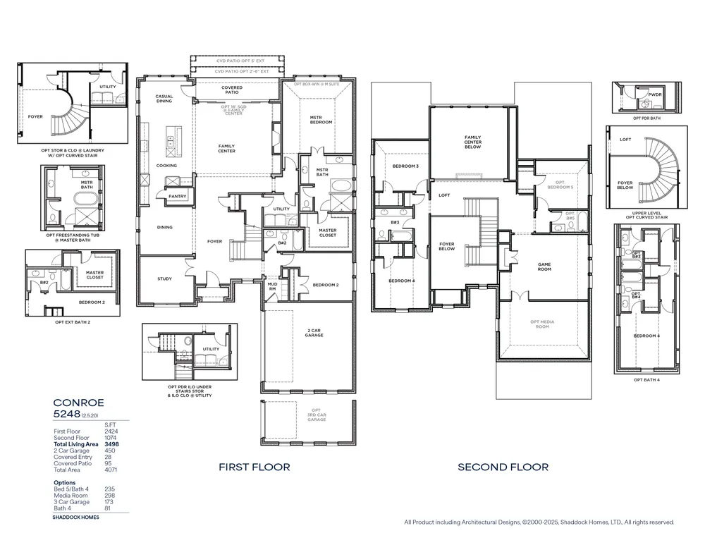 Popular open concept home features a dramatic two-story entry and family room with a fireplace. The two-story family room showcases a wall of windows that provides an abundance of natural light. Nail-down wood floors flow through the main living spaces, while plush carpeting adds warmth to the bedrooms and media room. The beautiful gourmet kitchen offers quartz countertops, upgraded built-in appliances, and a large walk-in pantry. The spacious primary retreat includes a generously sized bathroom with a beautiful freestanding tub, separate shower, and separate sinks and countertops. The primary bedroom, guest bedroom, and study are all located on the first floor. Upstairs, the game room and media room are situated together, creating an ideal entertainment space. Additional upgrades include box windows in the primary bedroom, family room, and game room. A covered back patio provides an inviting outdoor entertainment space.