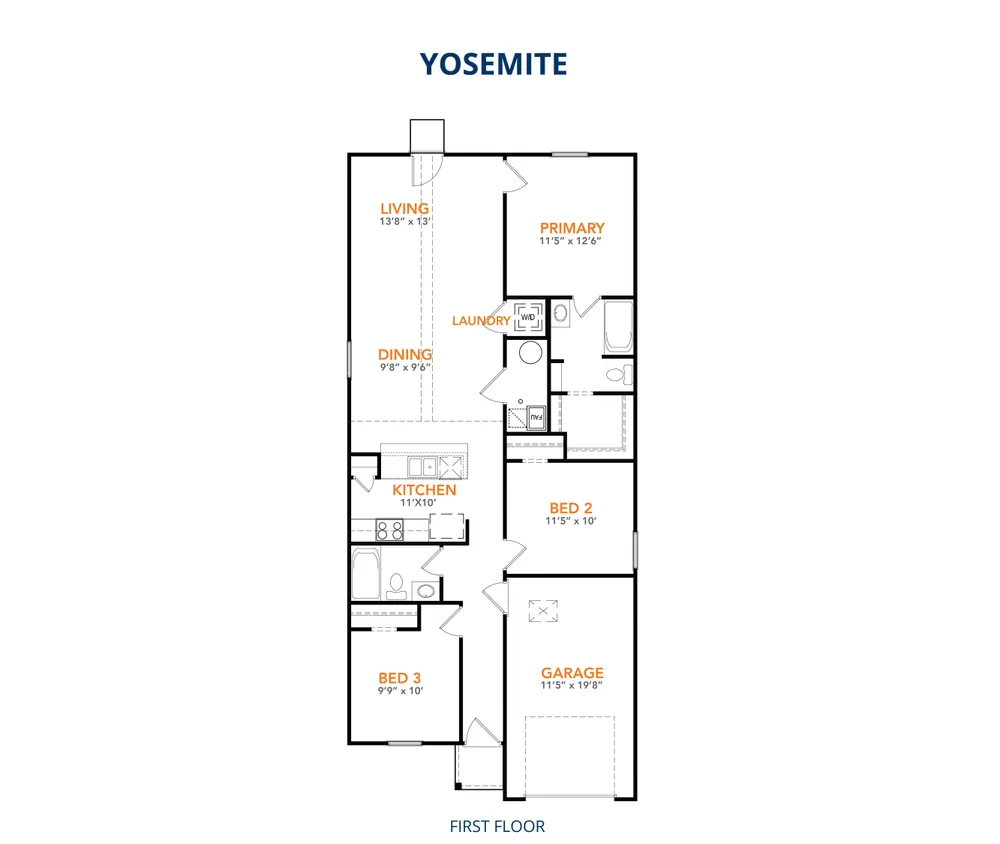 The Yosemite Plan from our Freedom Series is a cozy and efficient single-story home featuring 3 bedrooms, 2 bathrooms, a 1-car garage, and 1,202 square feet of smartly designed living space. This split-level floorplan places two secondary bedrooms and a full bathroom at the front of the home, offering privacy and convenience. Continue into the open-concept living area, where the kitchen with a central island overlooks the dining area and family room— perfect for meals, gatherings, and quality family time. The primary suite is thoughtfully positioned off the family room for added privacy and includes a private bathroom and walk-in closet. The laundry room is also conveniently located on this side of the home for easy access. Known for providing the lowest price and price per square foot, National Homecorp is here to help you get more home for your money! SELLER-Paid Closing Costs: Enjoy up to 3% closing cost contribution when you use NHC Mortgage and our preferred title company. With more space for less money plus exclusive savings through seller-paid incentives, the Yosemite Plan is the smart choice for your next home. Start your journey to homeownership today! Disclaimer: Photos may not represent the actual home. They are for illustrative purposes only and may depict a similar home with the same floorplan.