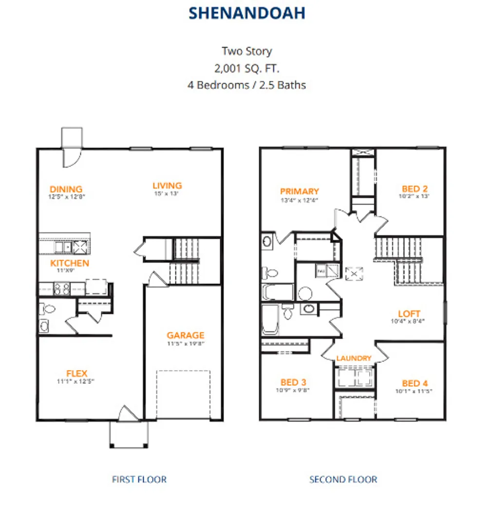 Model 2001 B1 - Shenandoah The Shenandoah Plan from our Freedom Series combines functional design with ample space, making it perfect for families of all sizes. This 2-story home offers 4 bedrooms, 2.5 bathrooms, a spacious loft, and 2,001 square feet of versatile living space. Step inside and you’ll first discover a flex room, ideal for a home office, playroom, or hobby space. Continuing down the hallway, a conveniently located half bathroom provides added ease for guests. At the heart of the home, the open-concept kitchen, complete with an island, overlooks the dining area and family room, creating the perfect setting for family time and entertainment. The staircase, located across from the kitchen, provides access to the upper level. The upper level is designed with comfort and convenience in mind. It features a private primary suite with an ensuite bathroom and walk-in closet, three secondary bedrooms, and a full bathroom. A spacious loft offers additional flexible space for a game room or cozy retreat. The laundry room is also on this level, making chores a breeze.