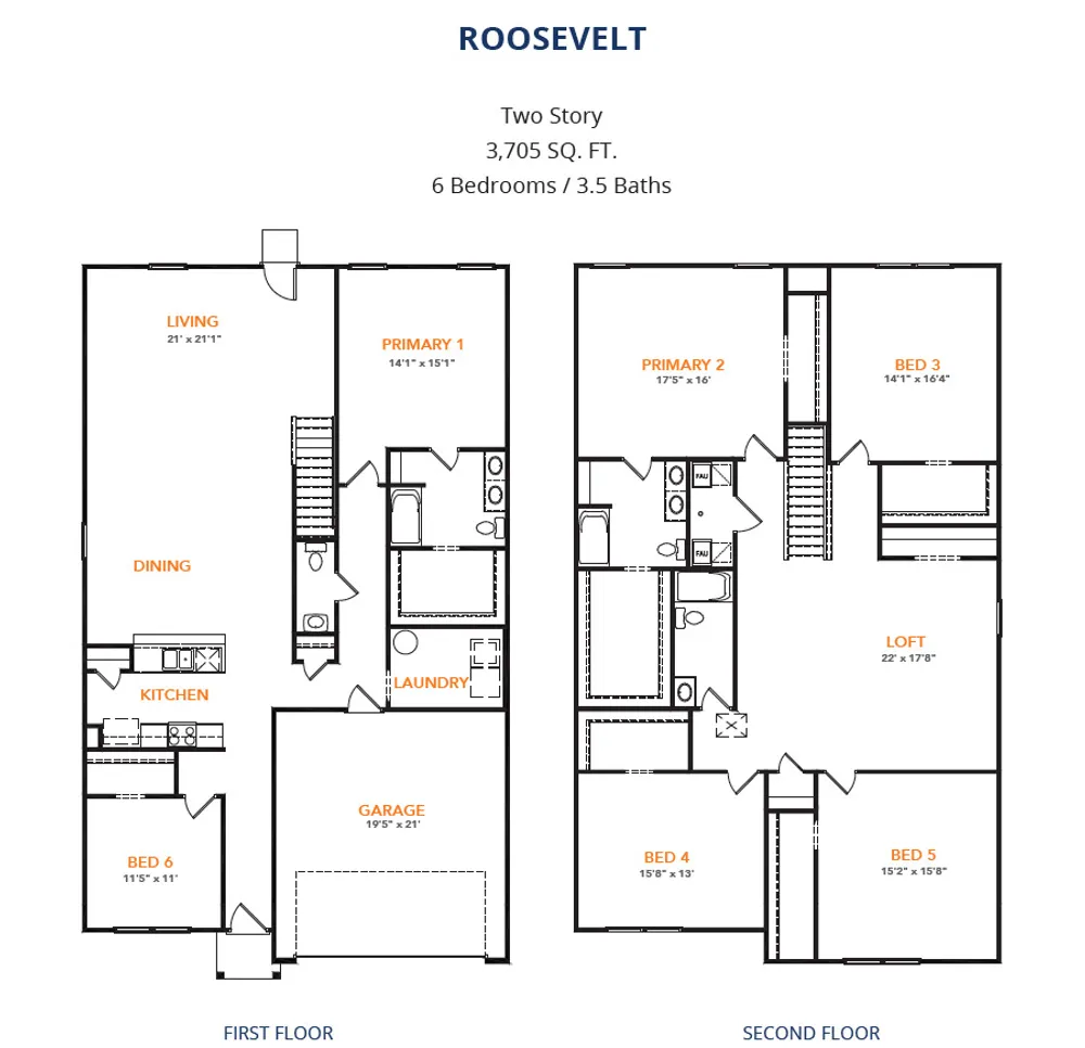 Model 3705 A3- Roosevelt The Roosevelt Plan from our Liberty Series offers an incredible amount of space, featuring 2 primary suites, 4 additional bedrooms, 3.5 bathrooms, a 2-car garage, and 3,705 square feet of thoughtfully designed living space. This two-story home is ideal for families seeking both versatility and privacy. The main level includes a primary suite with a private bathroom, an additional bedroom, a half bathroom, and a convenient laundry room. The open-concept kitchen, complete with an island, overlooks the dining area and spacious family room—creating the perfect space for gathering and entertaining. Upstairs, you’ll find a second primary suite with its own private bathroom, providing an ideal retreat. The upper level also features 3 additional bedrooms, another full bathroom, and a large loft, offering even more room for family activities or relaxation. SELLER-Paid Closing Costs: Enjoy up to 3% closing cost contribution when you use NHC Lender and our preferred title company.