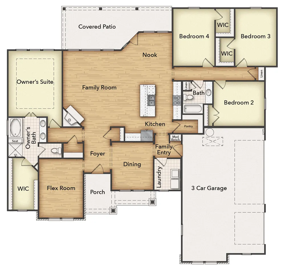 The 4-bedroom Colorado 3 presents a creative yet sensible layout of the homes 2,483 square feet of living space. Right from the front entrance, you can see the entire main living area. This open concept enhances the spacious feeling and makes it easy to have conversations no matter where you areperfect for entertaining! The kitchen is a definite eye-catcher in the Colorado 3. Weve incorporated a massive center island that doubles your counter space and provides comfortable seating for 4 people at the breakfast bar. You can also enjoy the view of the fireplace in the family room. If a formal dining room is on your new home wish list, check that off. Just a few steps from the kitchen, this floor plan has just the room for those special occasions. If formal isnt your thing, use this as a playroom or a living room. Across the foyer, the Colorado 3 also gives you a flex room to expand on the versatility. With a few small adjustments, you could convert it to a fifth bedroom. The design of the owner's suite is one of the (many) reasons people love this floor plan. The bedroom is nestled in the back of the home under a tray ceiling that accentuates the roominess. The Colorado 3 smartly uses space in the bathroom for both a soaking tub and step-in shower, along with dual vanities and a private water closet. Then your suite is completed with an expansive walk-in closet with wooden shelves and racks ready and waiting for your wardrobe. The 3 secondary bedrooms are clustered in a suite-like space on the other side of the homes layout. Two of them offer a walk-in closet, while the third one gives just a little bit more floor space. The 3 bedrooms share the homes second full bath. For a home that creates the ideal balance between togetherness and privacy, the Colorado 3 is fit to be tried!