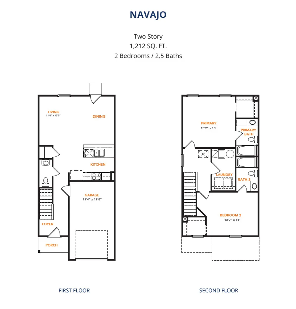 Model 1212 A1 - Navajo The Navajo Plan from our Celebration Series offers a thoughtfully designed two-story layout that blends open main-level living with private bedroom suites upstairs. With 2 bedrooms, 2.5 bathrooms, and 1,212 square feet of well-planned space, this home is ideal for buyers seeking comfort, efficiency, and modern design. The main level welcomes you with a covered front porch and foyer, leading into a hallway that opens to the kitchen, dining, and family room. The kitchen features an island with breakfast bar seating and generous counter space, opening to the dining and family room for easy everyday living. A patio door off the dining and living space provides access to outdoor enjoyment, while a convenient half bath completes the main level. Upstairs, the primary suite offers a private retreat with a walk-in closet and a dedicated full bath. A second bedroom also features its own private bath, making it ideal for guests or shared living. The laundry room is conveniently located on the upper level for added everyday ease. Known for providing the lowest price and price per square foot, National HomeCorp is here to help you get more home for your money! SELLER-Paid Closing Costs: Enjoy up to 3% closing cost contribution when you use NHC Mortgage and our preferred title company. With its efficient footprint, open living spaces, and private bedroom layout, the Navajo delivers smart two-story living with exceptional value. Start your journey to homeownership today! Disclaimer: Photos may not represent the actual home. They are for illustrative purposes only and may depict a similar home with the same floorplan.