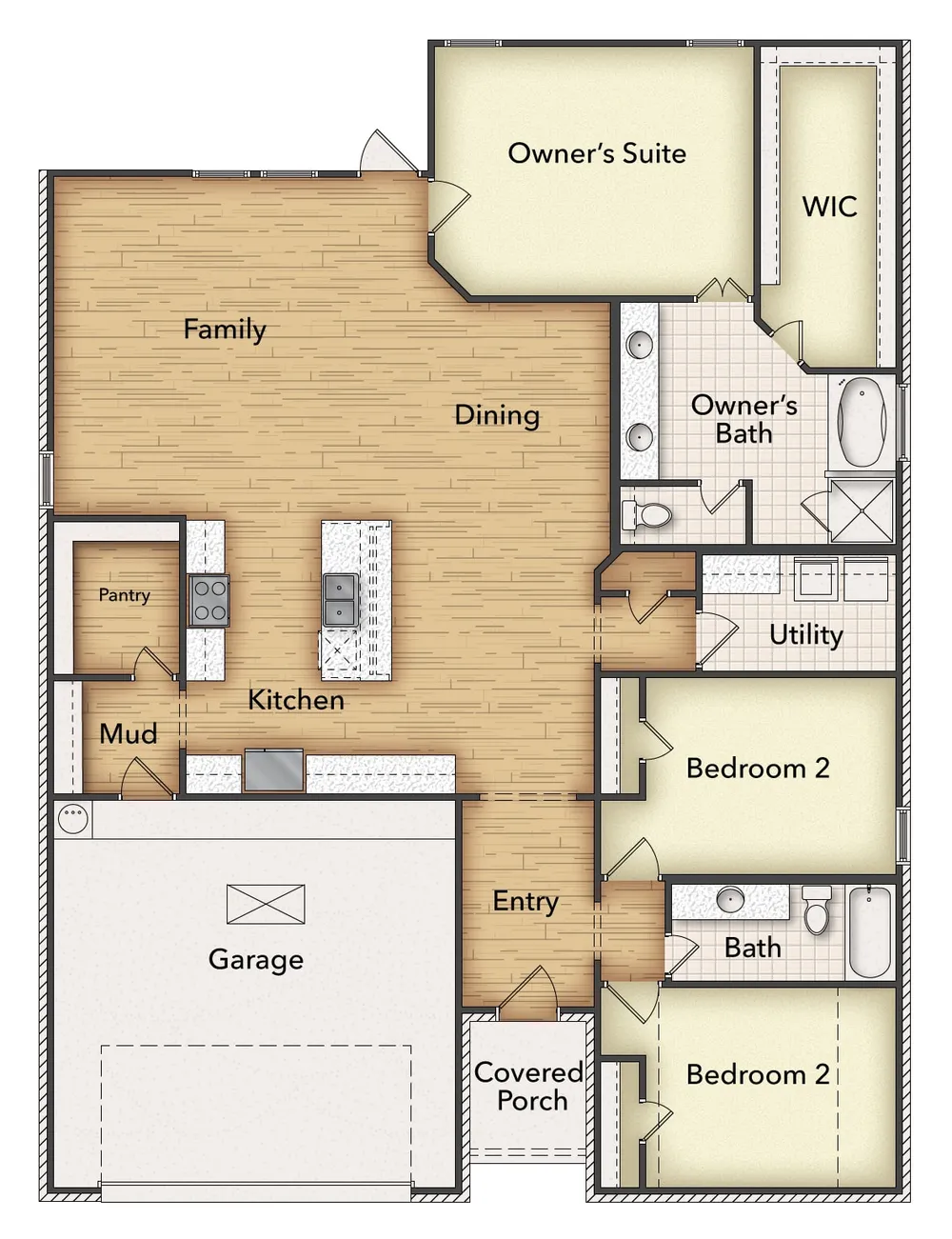 The Bailey is sized to fit so many lifestylesfirst-time homebuyer, the growing family, and anyone just looking for enough room to be comfortable. The 2,055-square-foot, single-level home design presents so many opportunities to create the home you want. Start with the exterior and choose from 3 elevations: Modern Farmhouse, Craftsman, or European. Step inside to a home that welcomes you with an open floor plan and 3 generously-sized bedrooms. The kitchen serves up ample prep space that includes a large center island. The pantry is like a room on its own, so you can stash everything you need for your culinary activity. The owner suite in the Bailey is an awe-inspiring space. Combine a huge bedroom that affords a sitting space with a walk-in closet/dressing room, and a owner's bath that gives both a soaking tub and step-in shower. The other 2 bedrooms share the second full bath in the home, with the laundry room separating those living spaces from your suitewhether or not you all equally share the laundry chore! Riverside Homebuilders includes many finishes in the Bailey, like a hall bench in the mudroom, granite countertops, and crown molding. If youre looking for something around 2,000 square feet, live large in this home.