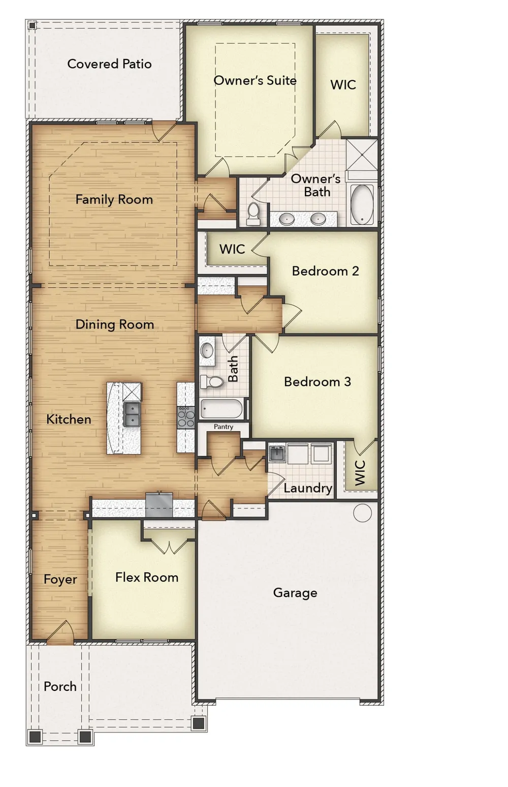 The San Saba has been a popular choice of homebuyers since we first introduced it. With the San Saba III, Riverside Homebuilders has taken the best features and expanded this flexible home design. The latest version of the floor plan adds nearly 100 square feet, totaling 2,266 square feet of interior living space. Weve kept the 3 bedrooms and 2 baths from the original floor plan, along with the walk-in closet for each of the bedrooms. The owners suite maintains the elegance of the tray ceiling in the bedroom and the spacious, smart design of the en suite bathroomwith both a soaking tub and walk-in shower, plus dual vanities and private water closet. In the San Saba III, the open concept spans the full length of this single-level home. Weve situated the kitchen a bit differently, making it quicker to access the laundry and mudrooms by the garages family entrance. The pantry is incorporated into the mudroom space, so unloading groceries is a simpler task. With the entrance from the foyer, the flex room in the San Saba III can easily function as a formal dining or living room. Add double doors, if you like, and the space works well as a home office or study. Maybe you want a fourth bedroom in your new home. This room is standard with a closet so it can easily be adapted to fill that role. The open concept in the main living area and the thoughtful placement of the bedrooms with vestibule entry presents the perfect balance of togetherness and privacy. Add in the covered patio for an outside living space that extends the comfort of this Riverside home.