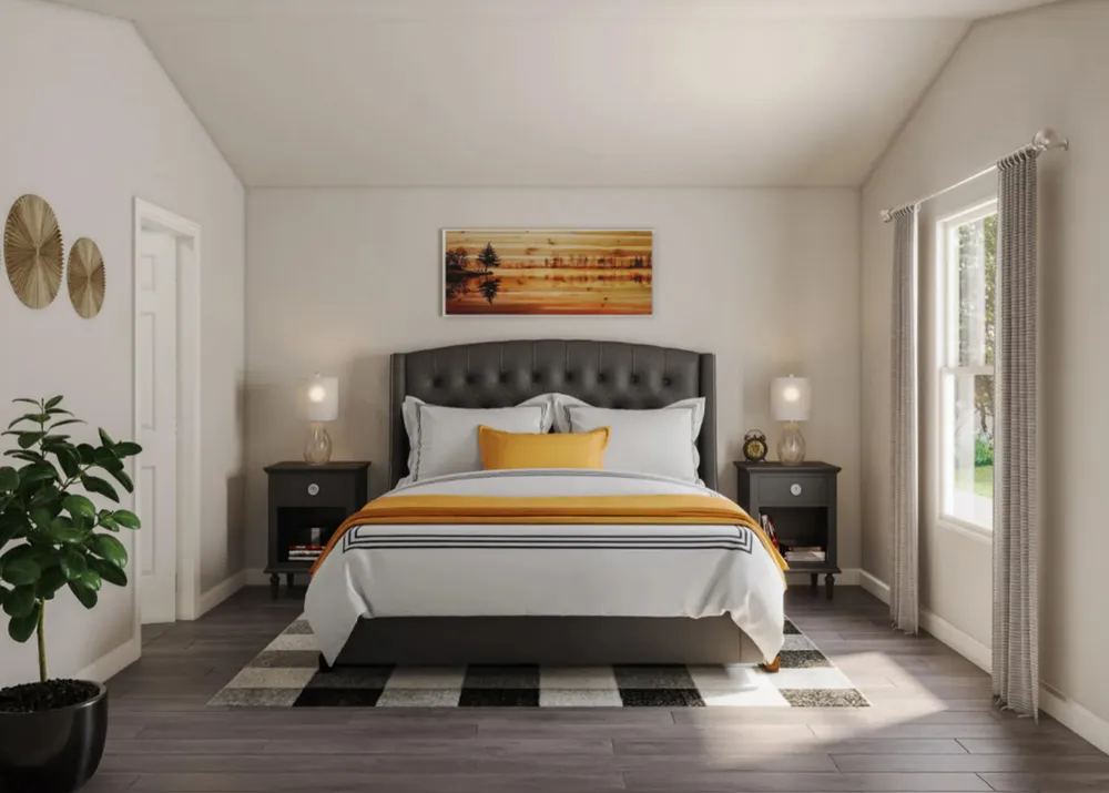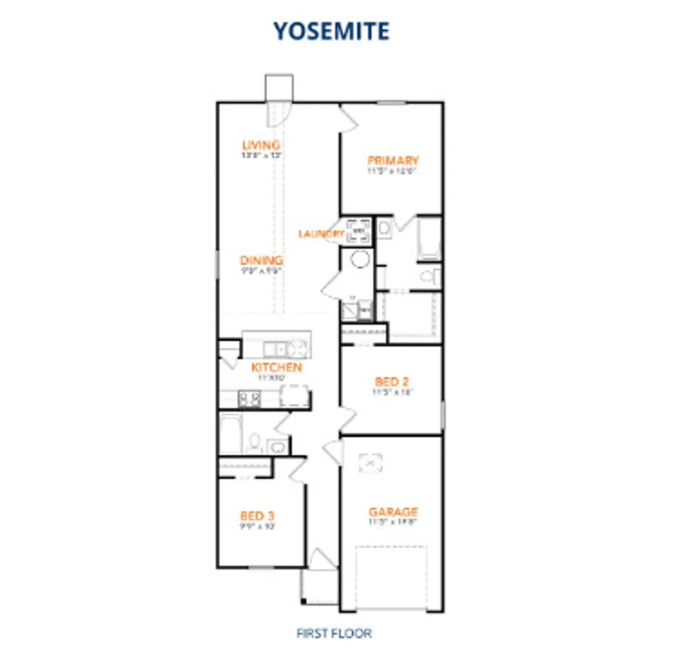 Model 1202 B1 - Yosemite The Yosemite Plan from our Freedom Series is a cozy and efficient single-story home featuring 3 bedrooms, 2 bathrooms, a 1-car garage, and 1,202 square feet of smartly designed living space.This split-level floorplan places two secondary bedrooms and a full bathroom at the front of the home, offering privacy and convenience. Continue into the open-concept living area, where the kitchen with a central island overlooks the dining area and family room—perfect for meals, gatherings, and quality family time. The primary suite is thoughtfully positioned off the family room for added privacy and includes a private bathroom and walk-in closet. The laundry room is also conveniently located on this side of the home for easy access.