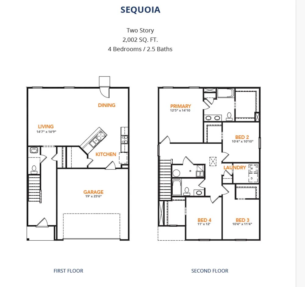 Model 2002 A1 - Sequoia The Sequoia Plan from our Freedom Series is a spacious 2-story home featuring 4 bedrooms, 2.5 bathrooms, and 2,002 square feet of living space, complete with a 2-car garage. Upon entering the home, you’ll pass the staircase to the upper level and a convenient half bathroom before arriving at the open concept living area. The family room flows effortlessly into the kitchen, which boasts an angled island that overlooks the dining area. This layout is perfect for family gatherings and everyday living. The upper level is designed with comfort and convenience in mind. The primary suite features a walk-in closet and a private bathroom for your retreat. Three secondary bedrooms, a full bathroom, and the laundry room complete this level, offering space and functionality for the entire household.