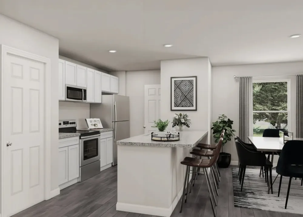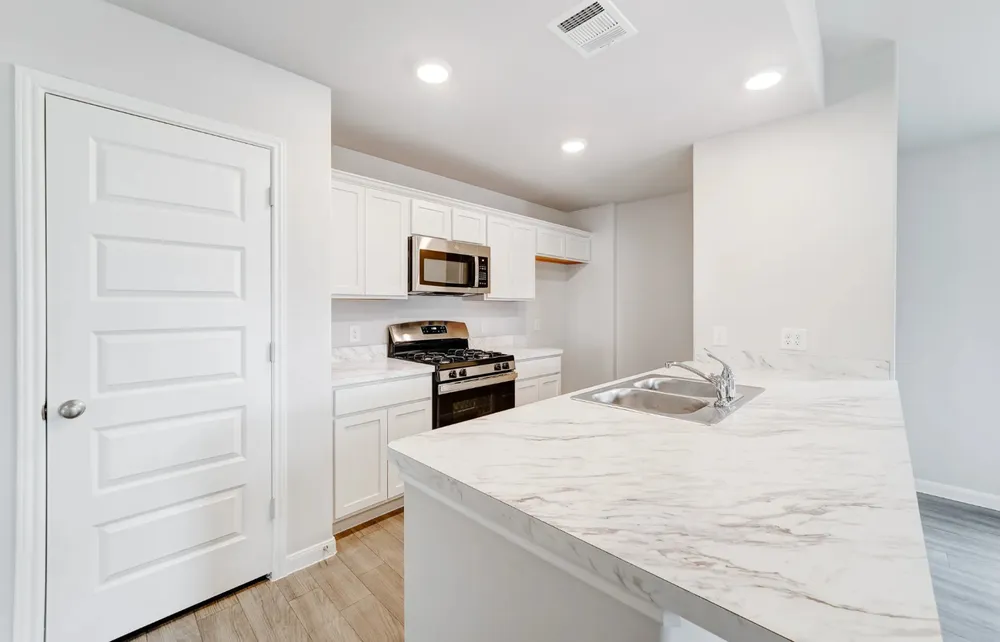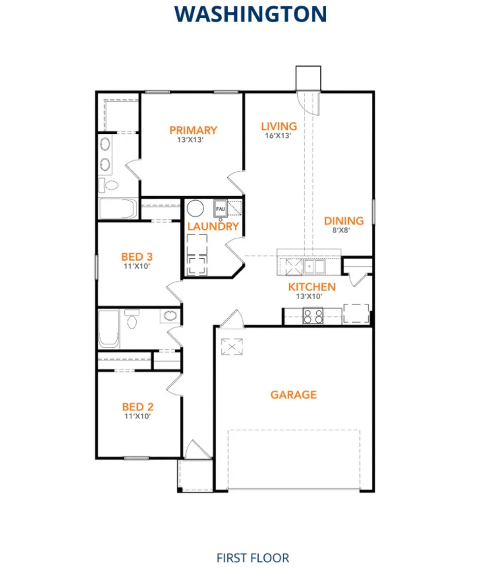 Model 1209 A4 - Washington The Washington Plan from our Liberty Series is a thoughtfully designed single-story home featuring 3 bedrooms, 2 bathrooms, a 2-car garage, and 1,209 square feet of functional living space. As you step inside, you’ll find two secondary bedrooms and a full bathroom conveniently located at the front of the home. Continue into the bright and open living area, where the kitchen with a central island seamlessly overlooks the dining area and family room, creating a perfect space for everyday living and entertaining. The laundry room is thoughtfully situated off the kitchen for easy access. The primary bedroom, located at the back of the home for added privacy, features a private bathroom and a walk-in closet, providing a comfortable retreat.