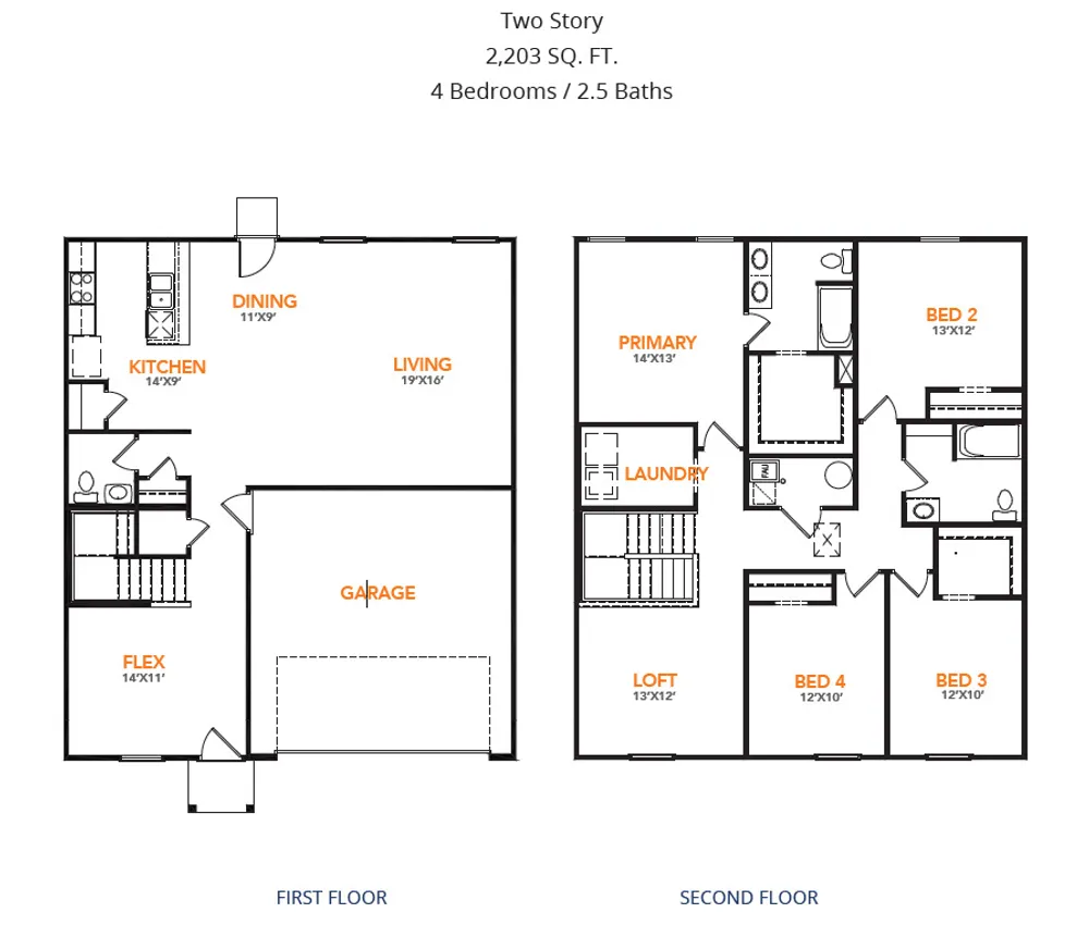 Harrison - B4 The Harrison Plan from our Liberty Series offers a perfect blend of comfort, practicality, and exceptional value. This 2-story home features 4 bedrooms, 2.5 bathrooms, a 2-car garage, and 2,203 square feet of thoughtfully designed living space. As you step inside, you’ll pass the versatile flex room before reaching the staircase to the upper level, a convenient closet, and half bathroom. The heart of the home is the open kitchen and living area, complete with a central island, a dining area, and a spacious family room — perfect for entertaining or relaxing with loved ones. Upstairs, the private primary suite awaits, featuring an en suite bathroom. Three additional bedrooms, one more full bathroom, a loft area for additional living space, and a convenient laundry room complete the upper level.