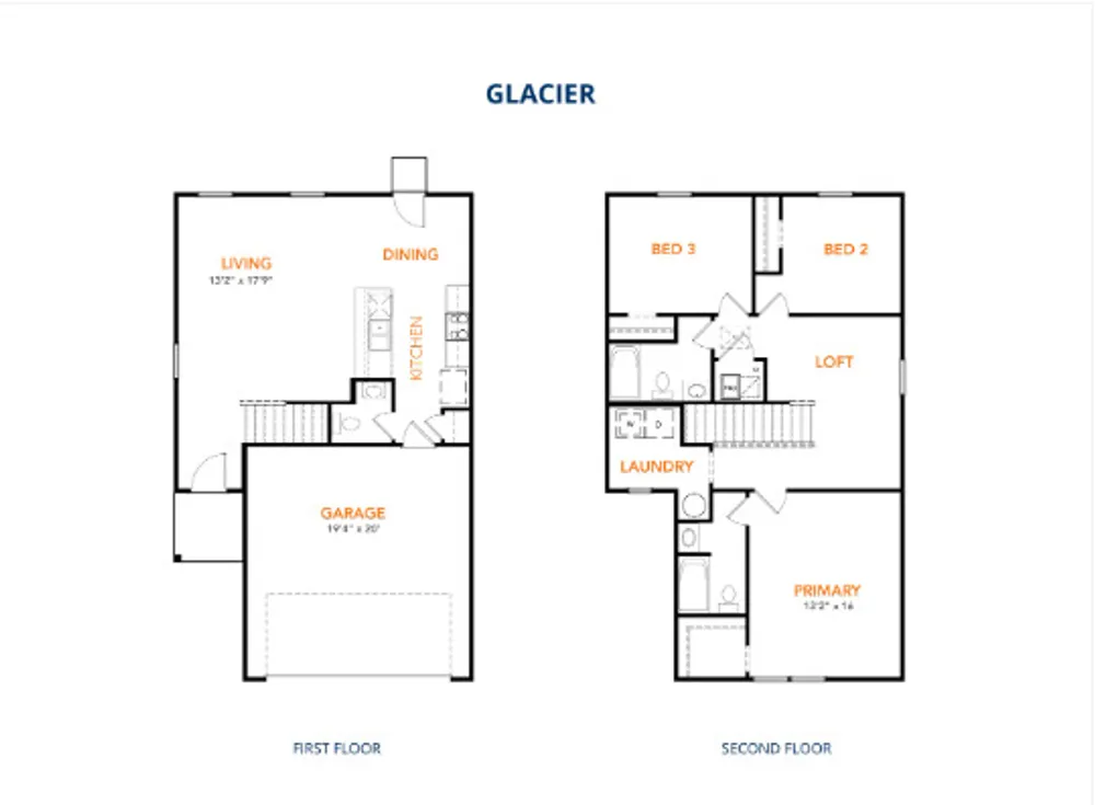 Model 1600-2 A2 Glacier The Glacier Plan from our Freedom Series is a thoughtfully designed 2-story home offering 3 bedrooms, 2.5 bathrooms, and 1,600 square feet of living space, complete with a 2-car garage. As you step inside, you’ll pass the staircase to the upper level before arriving at the bright and open family room. This inviting space flows seamlessly into the kitchen and dining area, creating the perfect setting for family time or entertaining. A convenient half bathroom is located just off the kitchen for easy access. The upper level is designed for relaxation and privacy, featuring a spacious primary suite with a walk-in closet and a private bathroom. Two secondary bedrooms, a full bathroom, and a laundry room complete this level. A large loft provides additional living space, ideal for a playroom, media area, or home office.